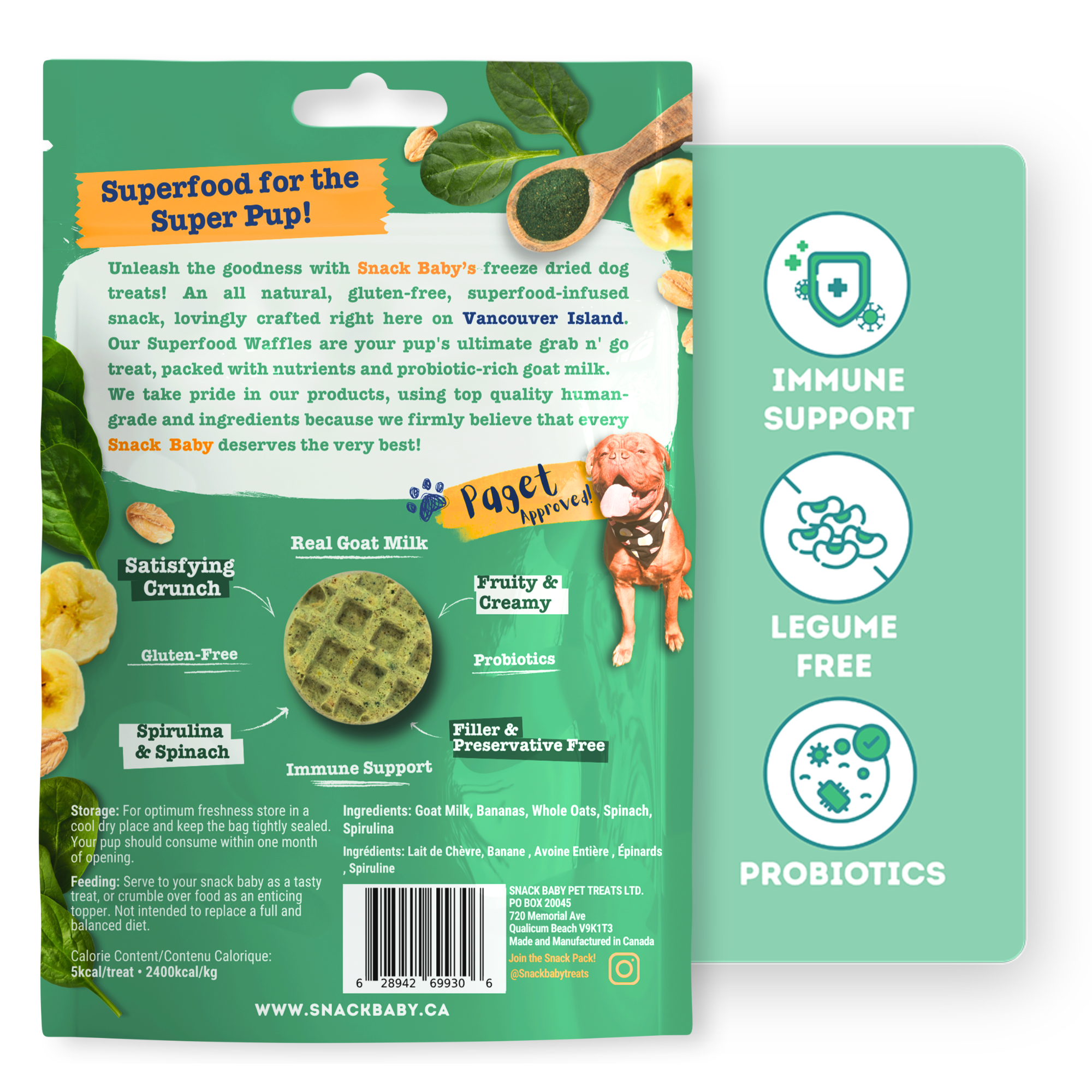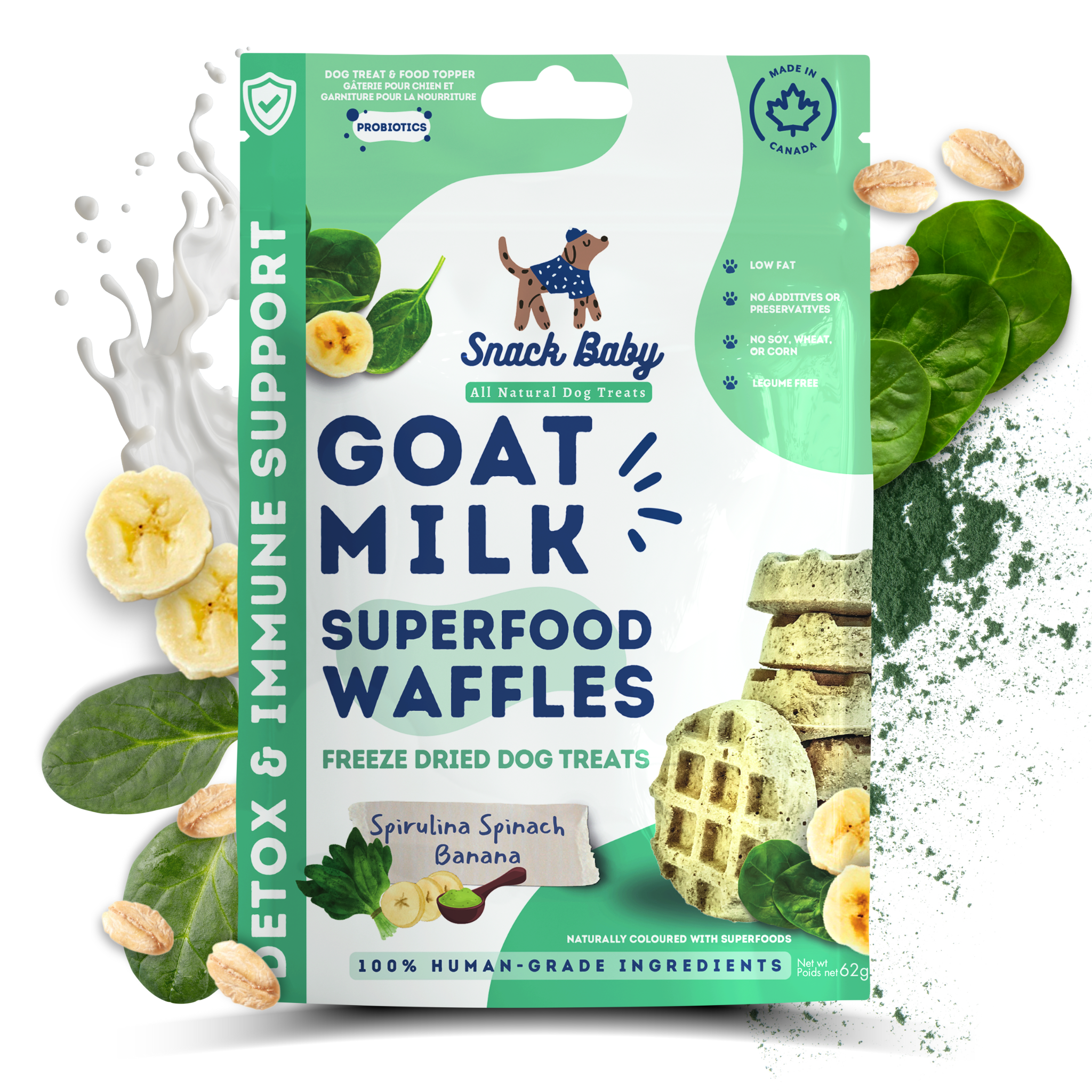 Snack Baby's Superfood Waffles with spirulina and spinach are made with 100% natural superfood ingredients to keep your pup healthy and happy. We use goat milk as our main ingredient to promote a healthy balance of gut bacteria, spinach for immune support, and spirulina for detoxification.