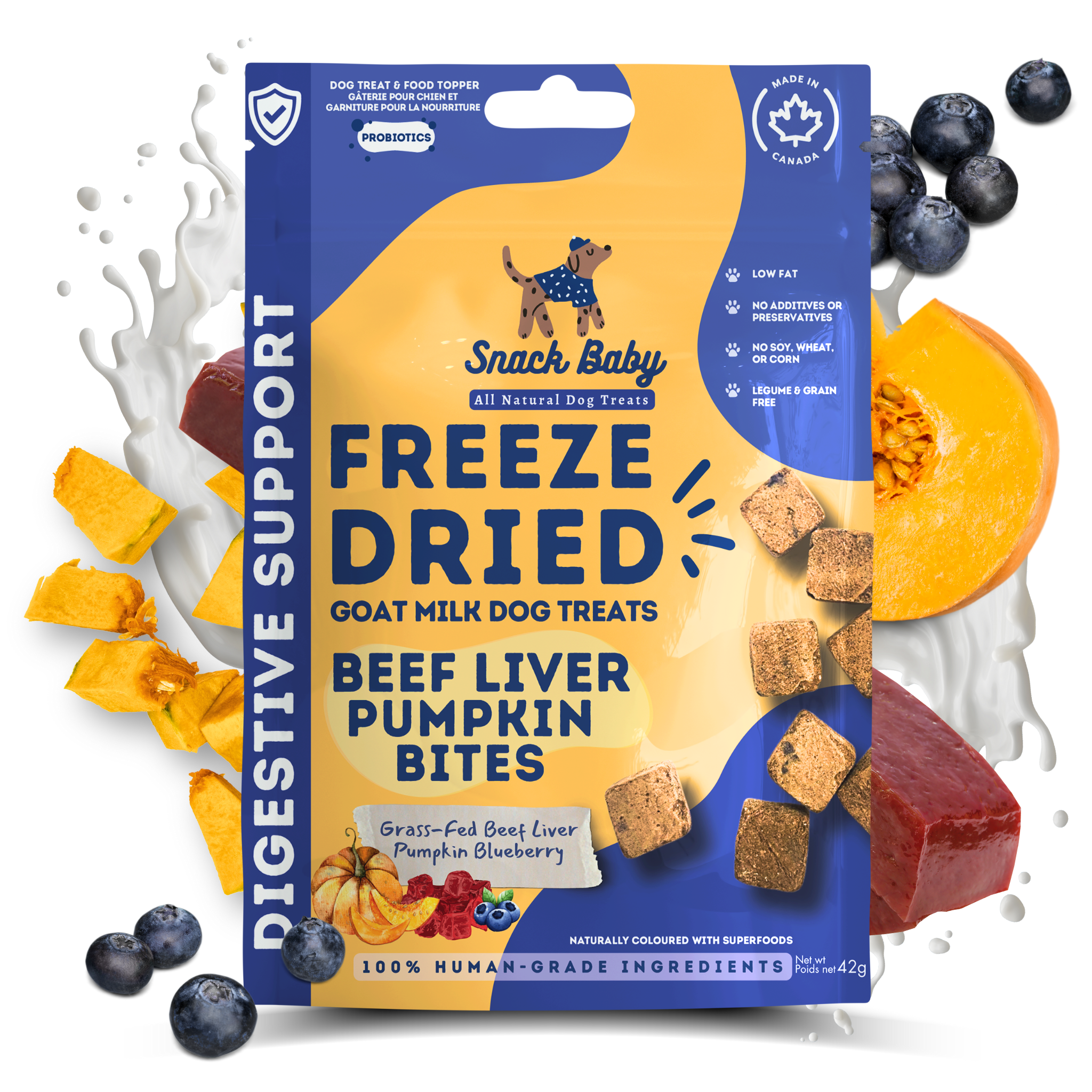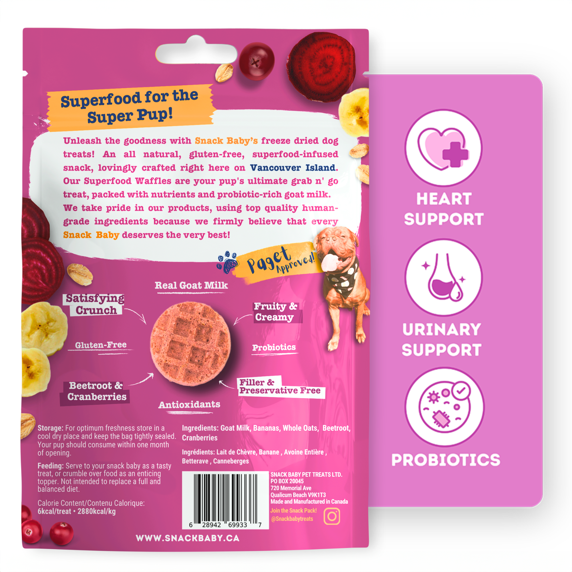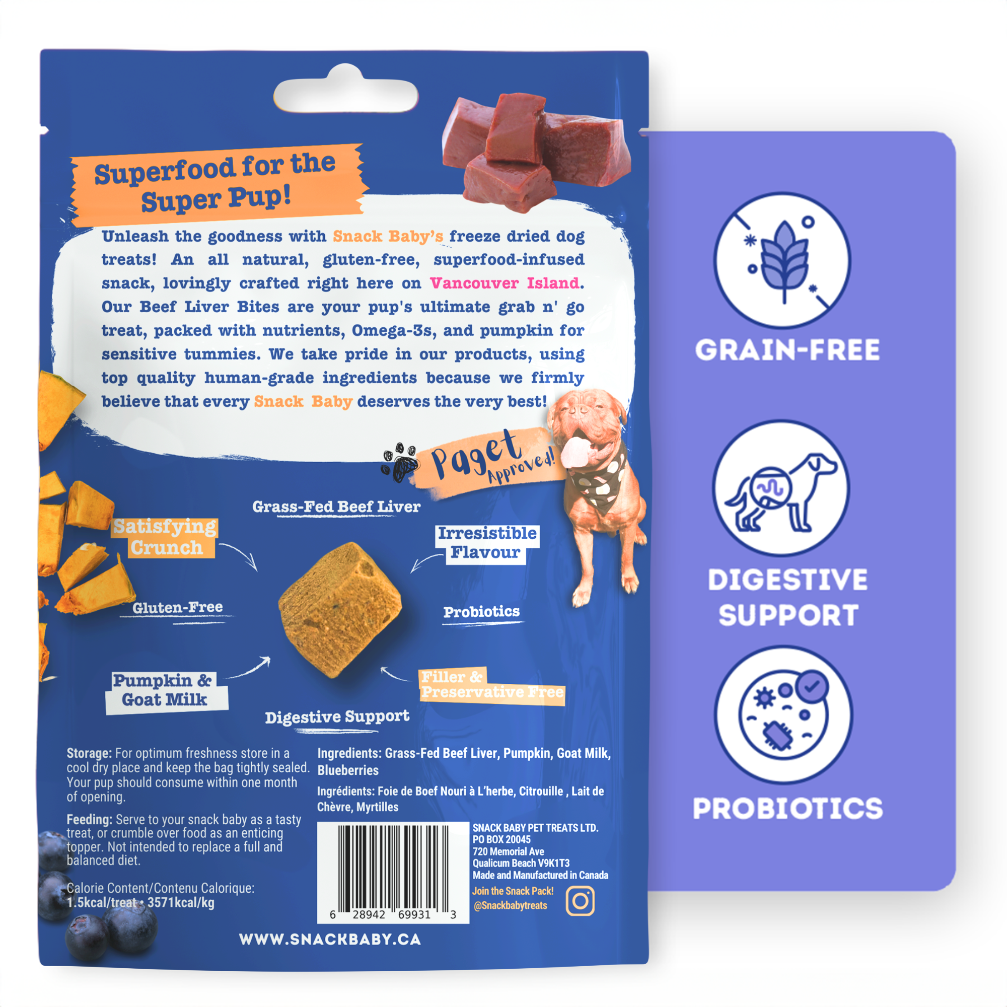 Unleash the goodness with Snack Baby’s freeze dried dog treats! An all natural, gluten-free, superfood-infused snack, lovingly crafted right here on Vancouver Island. Our healthy dog treats are your pup's ultimate grab n' go snack, packed with nutrients and probiotic-rich goat milk. We take pride in our products, using top quality human-grade ingredients because we firmly believe that every Snack Baby deserves the very best!